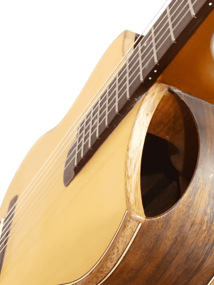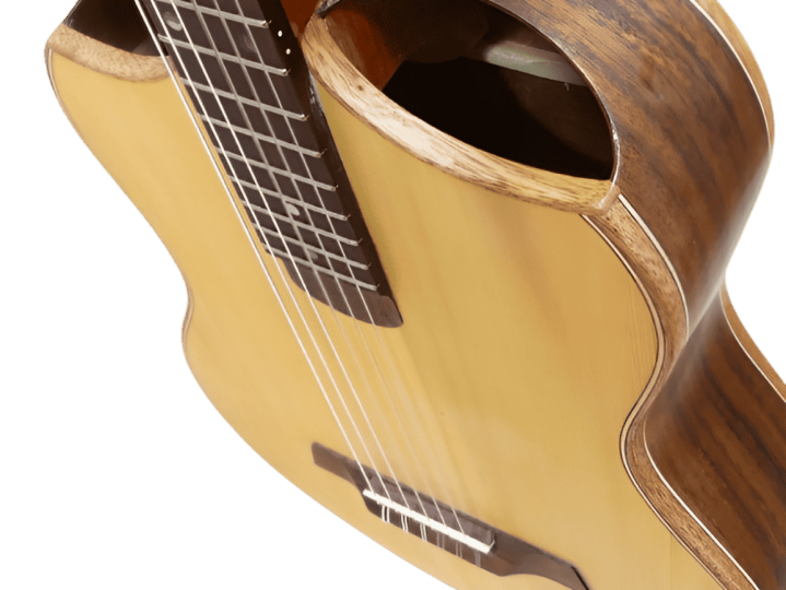 La table est percée d'une ouïe traditionnelle. La tête plaquée camphre est équipée de mécaniques Schaller. Un tissu de carbone renforce le manche en Maogani, une essence de la forêt de Saint-Philippe. La touche de 19 frettes est en Eucalyptus robusta, 12ᵉ frette à la caisse. C'est un bois très dur provenant d'un magnifique arbre qui pousse en zone humide. Sa dureté rend la touche résistante à l'usure des cordes. Les repères de gros diamètre donnent à cette guitare une touche naïve.